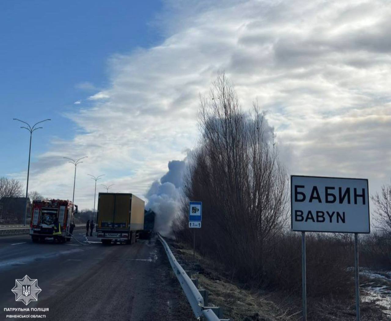 На автодорозі М-06 "Київ — Чоп" у селі Бабин Рівненської області сталося загоряння вантажного автомобіля. Через ліквідацію пожежі рух у напрямку Києва був тимчасово перекритий.