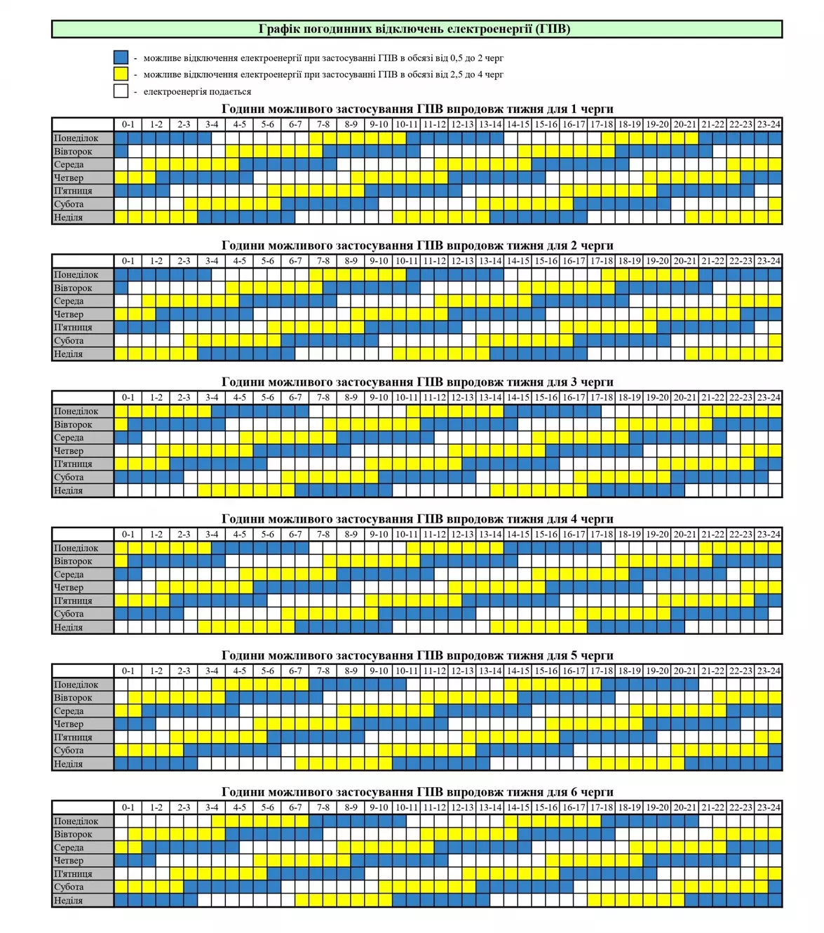 "Ці графіки не означають автоматичного чи щоденного застосування відключень. Вони вводяться лише у разі розпоряджень від НЕК "Укренерго" — NPC Ukrenergo, а також у виняткових ситуаціях — наприклад, у випадку масованих вражень енергосистеми дронами чи ракетними ударами", — зазначає прес-служба компанії.