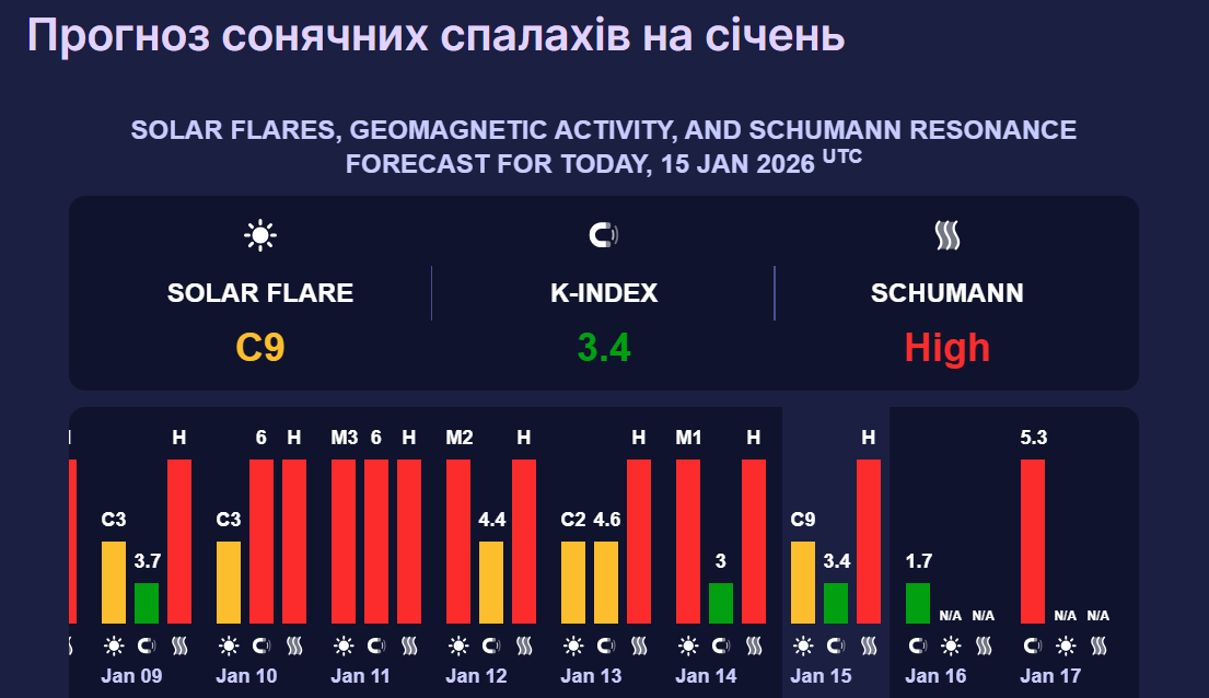 А вже у суботу, 17 січня, космічна погода значно погіршиться, а сонячна активність зросте до 5,3 бала, що відповідає магнітній бурі червоного рівня. Метеозалежні люди можуть відчувати головний біль та втому.