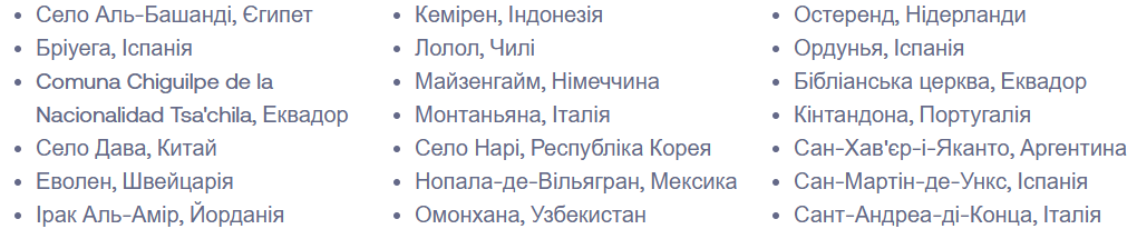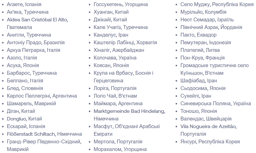 Список 52 найкращих туристичних сіл за версією ООН з туризму 2025 року виглядає наступним чином (в алфавітному порядку за селами):