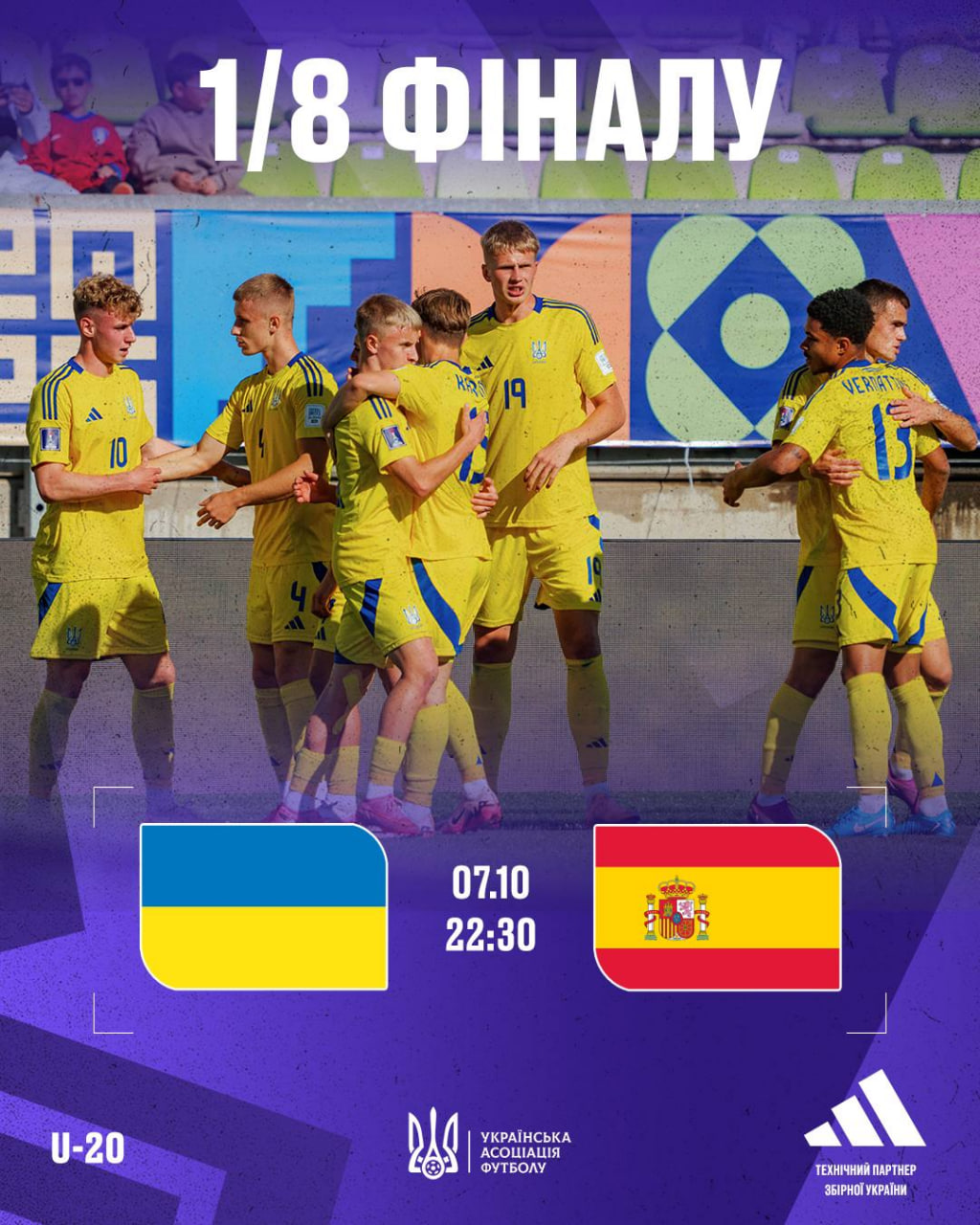 У вівторок, 7 жовтня, у межах матчу 1/8 фіналу Чемпіонату світу 2025 збірна України U-20 зіграє проти однолітків з Іспанії. На груповому етапі турніру українська команда здобула дві перемоги та один раз зіграла внічию.