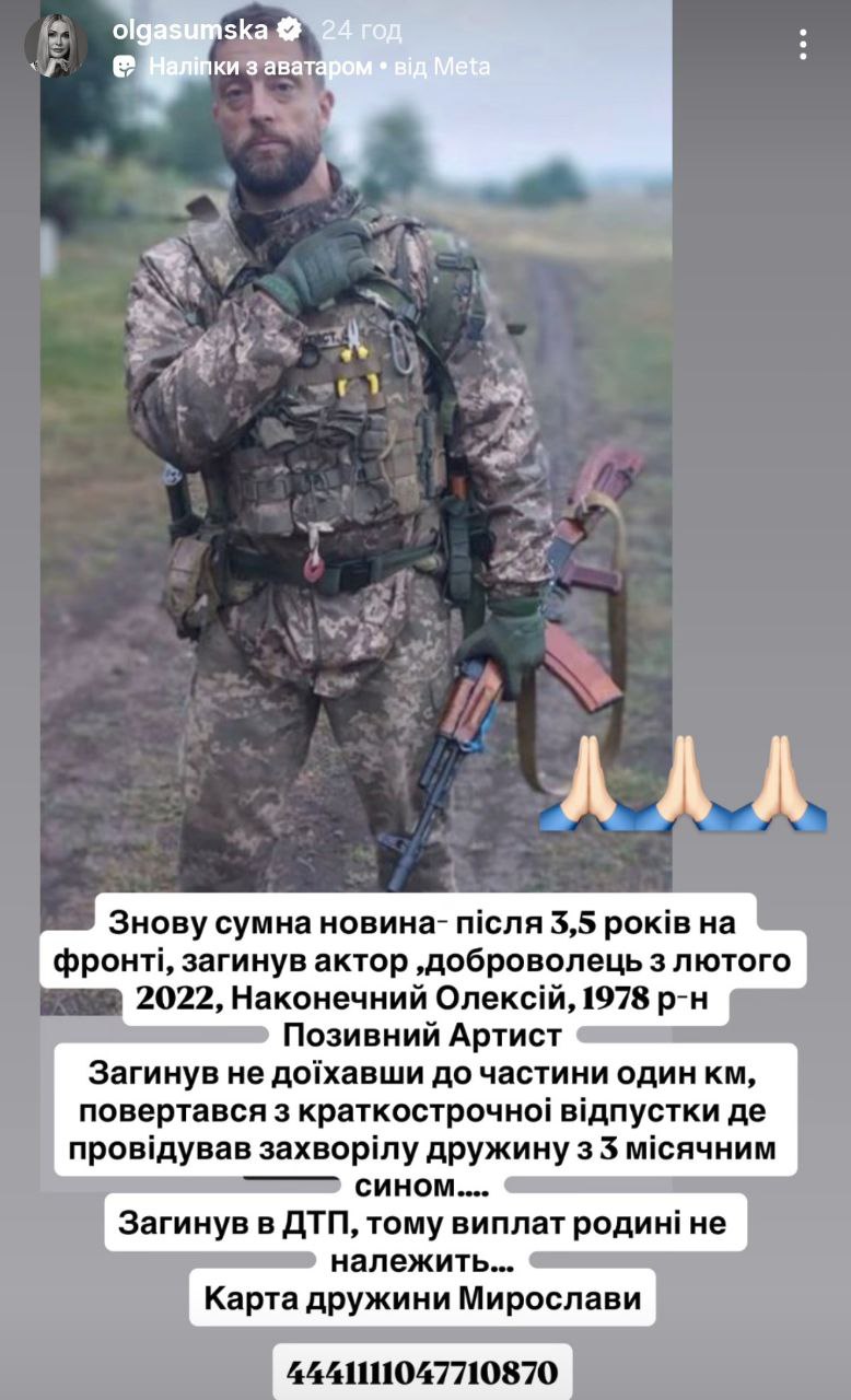 "Загинув актор Олексій Наконечний не доїхавши до частини один кілометр, повертався з короткострокової відпустки, де провідував дружину, яка захворіла, і тримісячного сина", — прокоментувала вона своє "сторіз".