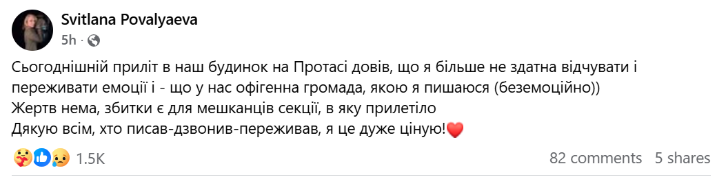 "Сьогоднішній приліт в наш будинок на Протасі довів, що я більше не здатна відчувати та переживати емоції і, що у нас "офігенна" громада, якою я пишаюся (беземоційно)", — написала вона на своїй сторінці у Facebook.