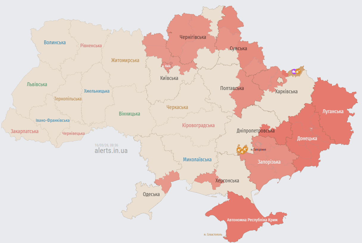 Станом на ранок понеділка, 16 березня, Київ опинився під прицілом ворожих дронів-камікадзе, які прориваються до міста з декількох напрямків одночасно. Повітряна тривога триває, а сили протиповітряної оборони готуються до відбиття атаки безпосередньо у межах столиці та на підступах до неї.