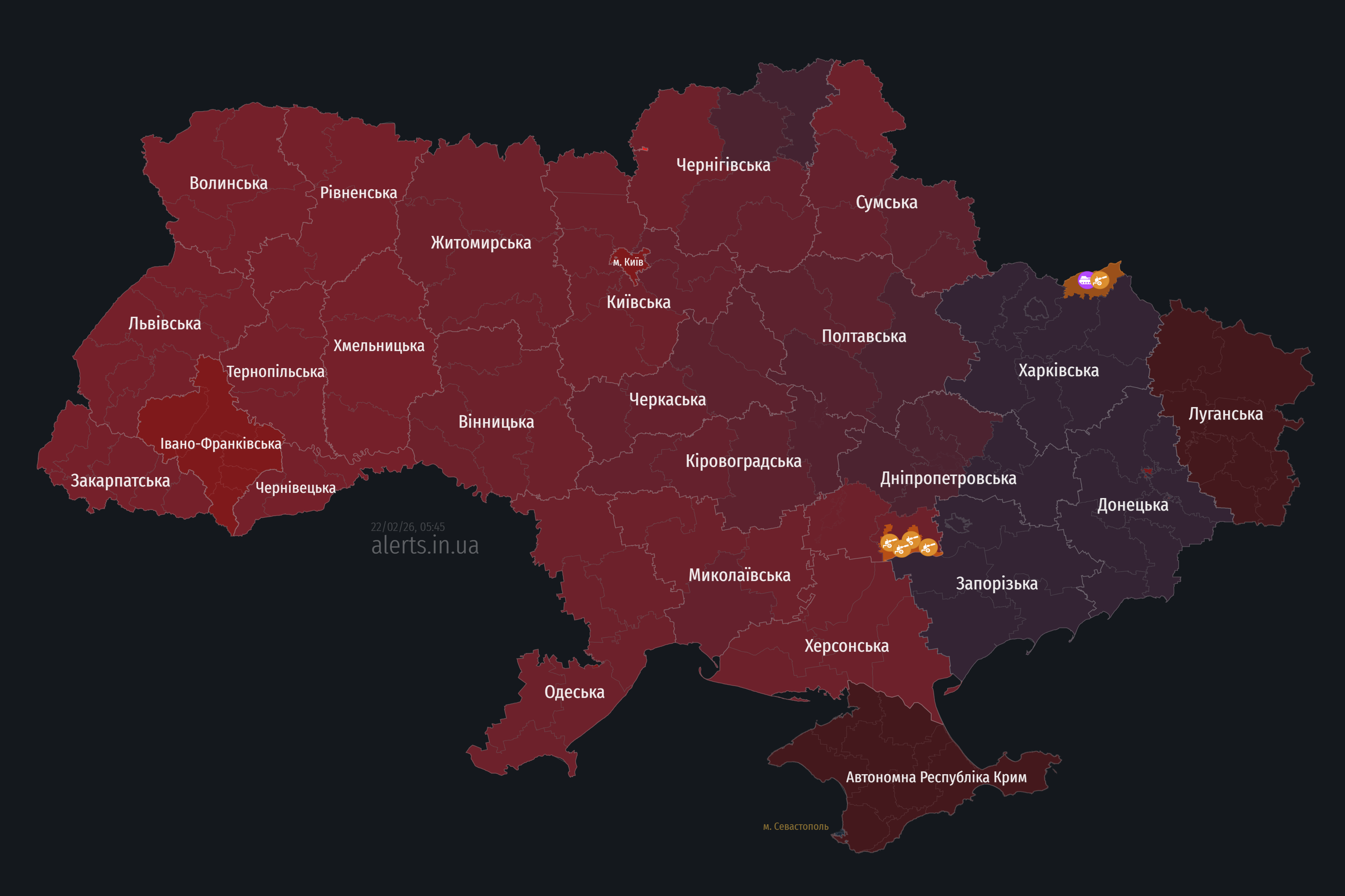 У ніч на неділю, 22 лютого, російські загарбники здійснюють масовану атаку по Україні зі застосуванням крилатих ракет. Також зберігається небезпека ударних дронів.