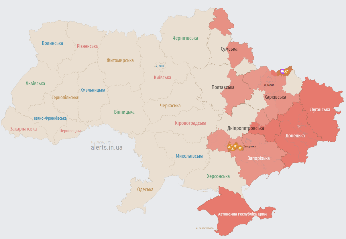 У понеділок, 16 березня, повітряна тривога охопила значну частину країни через активність ворожих ударних безпілотників у ранкові години. Загроза ударів залишається актуальною для Дніпропетровщини та Полтавщини, де зафіксовано рух дронів безпосередньо у бік великих міст.
