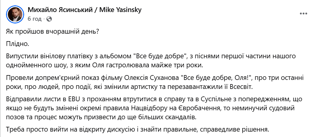 "Відправили листи в EBU з проханням втрутитися в справу та в "Суспільне" з попередженням, що якщо не будуть змінені окремі правила Нацвідбору на "Євробачення", то неминучий судовий позов та процес можуть призвести до ще більших скандалів", — зазначив він.