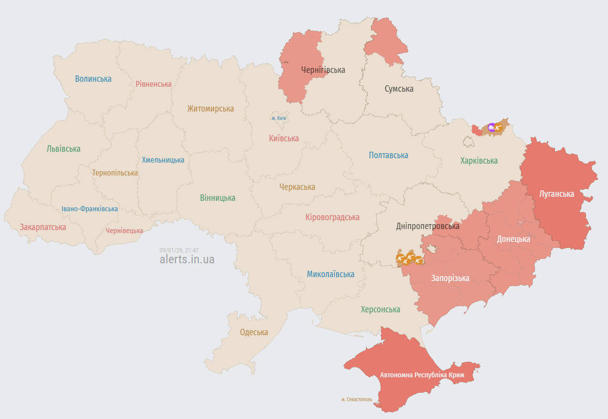 У п'ятницю ввечері, 9 січня, російська армія атакує Україну ударними безпілотниками. Повітряну тривогу оголошено у низці областей на Півночі та Півдні нашої держави.