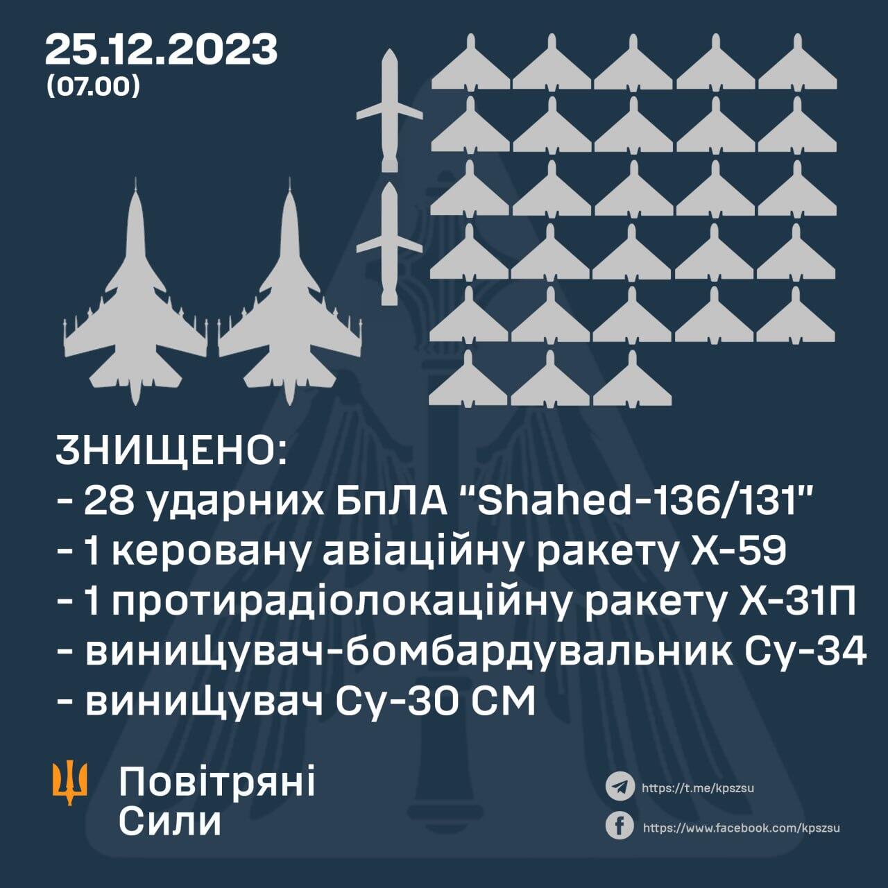 Вночі 25 грудня війська країни-агресорки атакували Україну ударними безпілотниками типу "Шахед" та двома авіаційними ракетами. Протиповітряна оборона знищила майже всі ворожі цілі.