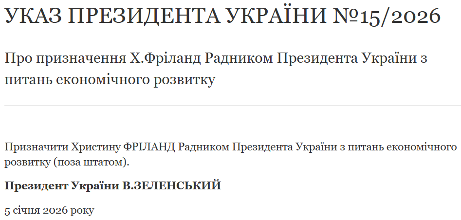У понеділок, 5 січня, президент Володимир Зеленський підписав низку указів, що стосуються кадрового підсилення його команди та стратегічного напрямку економічного розвитку. Йдеться про призначення на нові посади для Сергія Кислиці та Христини Фріланд.