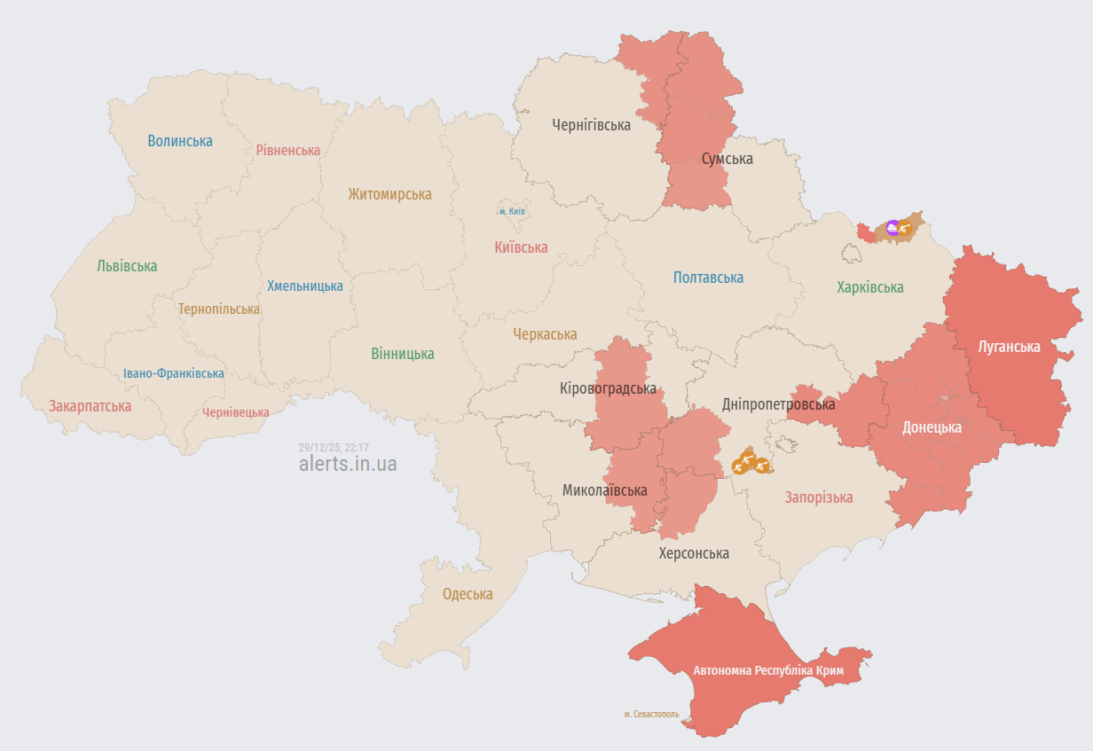 У понеділок, 29 грудня, російська армія атакує Україну ударними безпілотниками. Ворожі дрони фіксуються у низці областей.