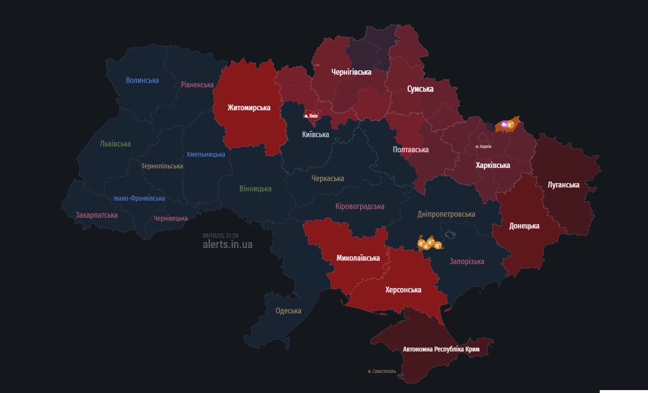 Ввечері 9 жовтня у Києві та низці областей оголошено повітряну тривогу. Існує загроза ударів дронами.