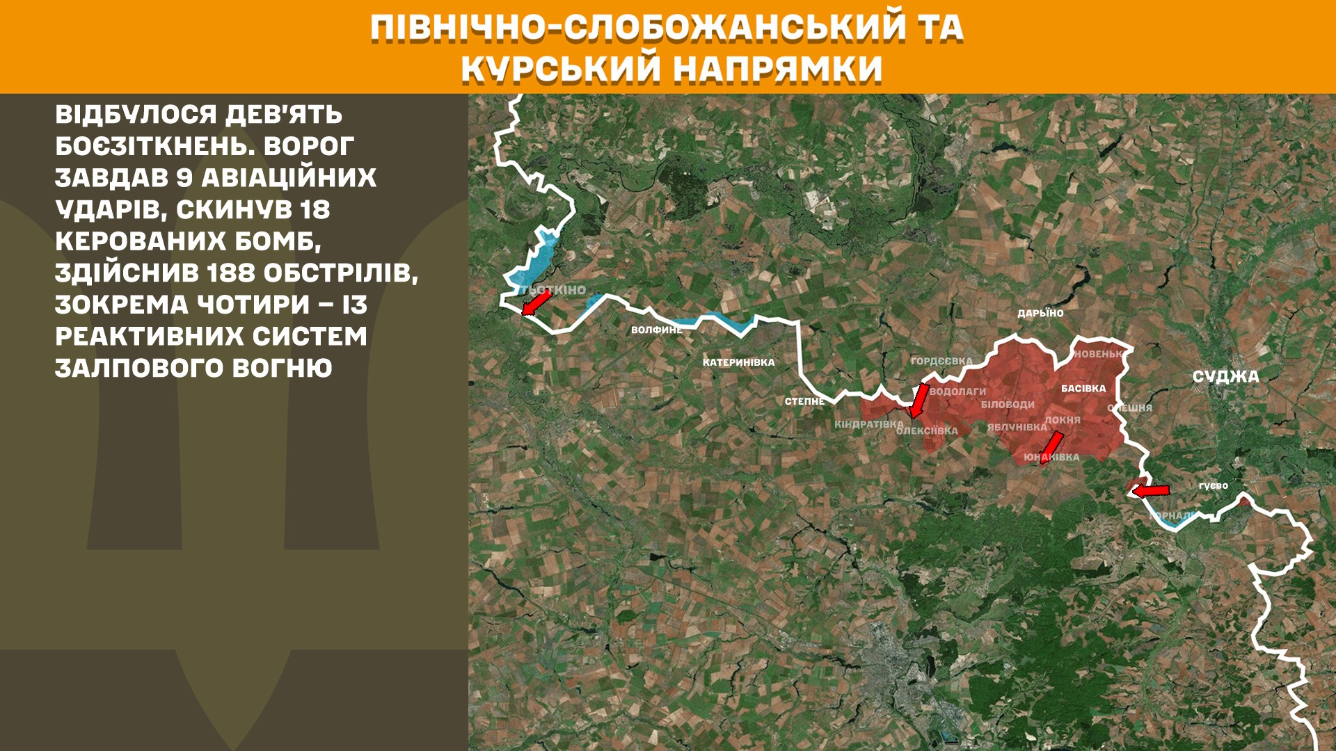 На Північно-Слобожанському і Курському напрямках відбулося дев’ять боєзіткнень. Ворог завдав 9 авіаційних ударів, скинув 18 керованих бомб, здійснив 188 обстрілів, зокрема чотири – із реактивних систем залпового вогню.