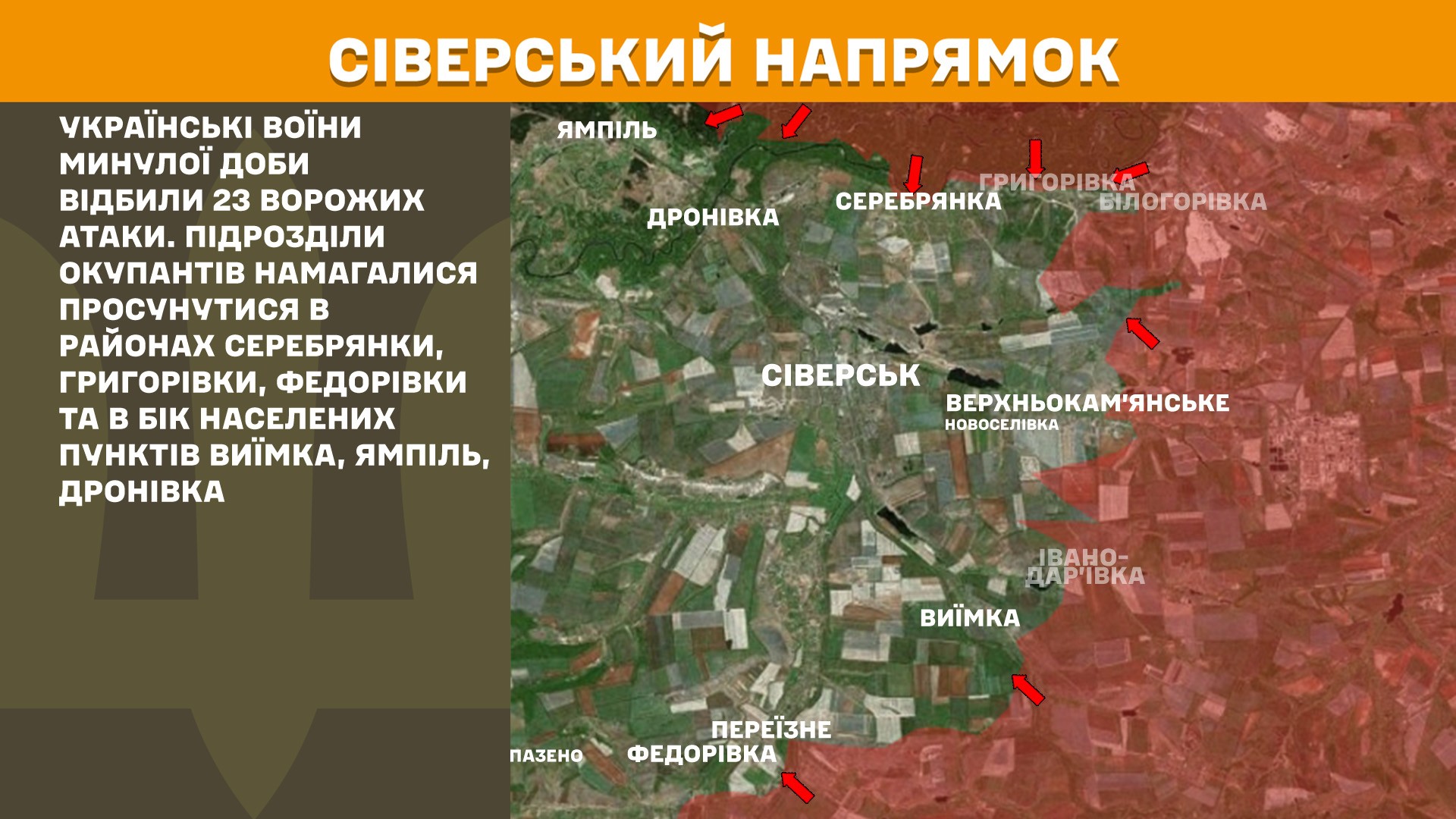 На Сіверському напрямку українські воїни минулої доби відбили 23 ворожих атаки. Підрозділи окупантів намагалися просунутися в районах Серебрянки, Григорівки, Федорівки та в бік населених пунктів Виїмка, Ямпіль, Дронівка.