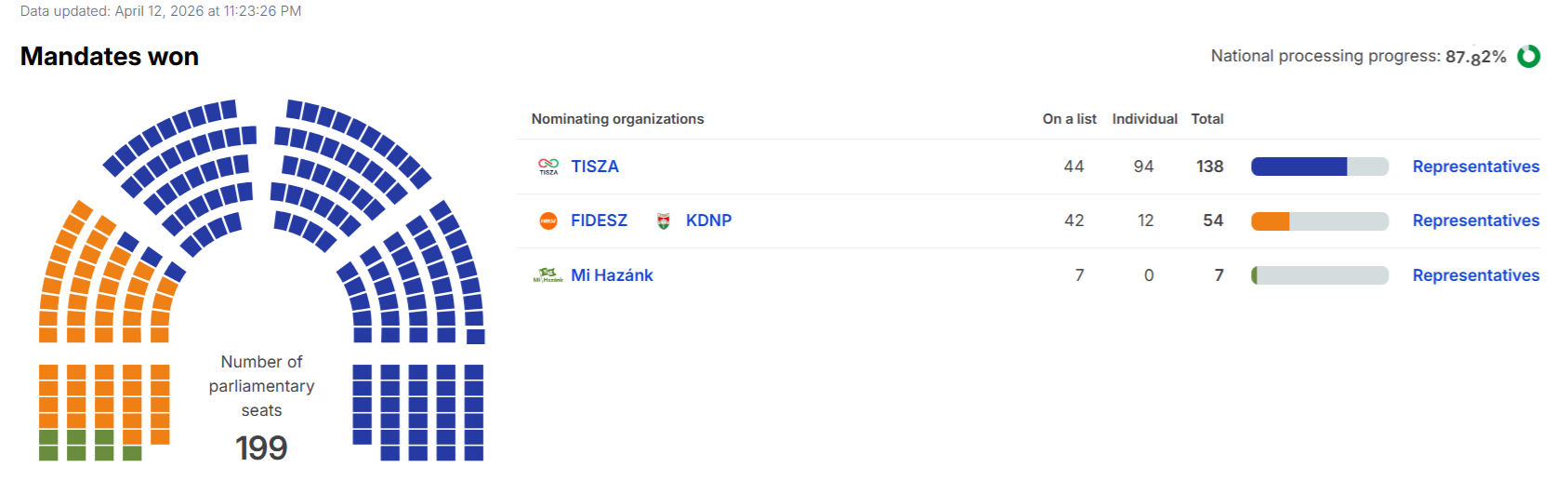 Виборча комісія Угорщини підрахувала вже 87,82% голосів. Опозиційна партія "Тиса" пішла у відрив і, за попередніми підрахунками, забирає конституційну більшість — 138 місць (за необхідних 133), у "Фідеса" — 54., в ультраправої "Нашої батьківщини" — 7.