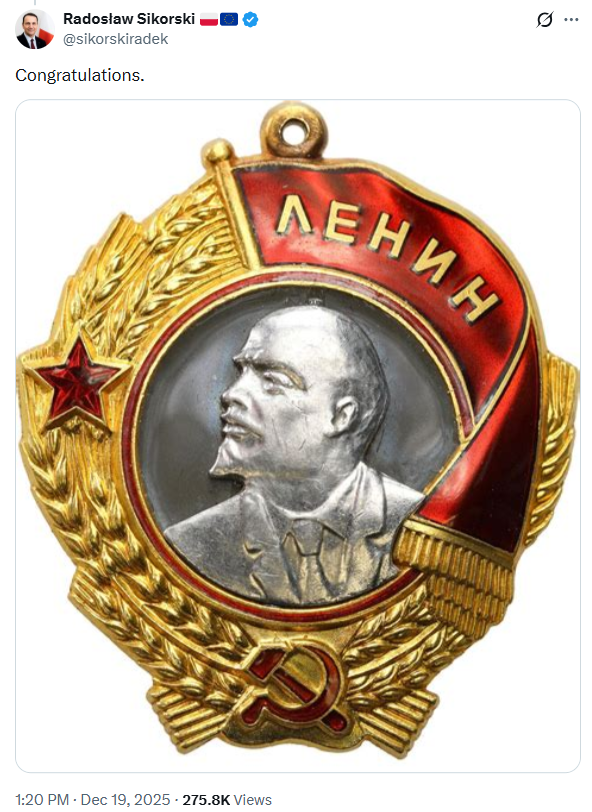 На такі цинічні тези очільник зовнішньополітичного відомства Польщі відповів із притаманною йому іронією. Радослав Сікорський опублікував допис зі словом "Вітаю", до якого додав зображення радянського ордена Леніна, натякаючи на справжню спрямованість політики офіційного Будапешта.