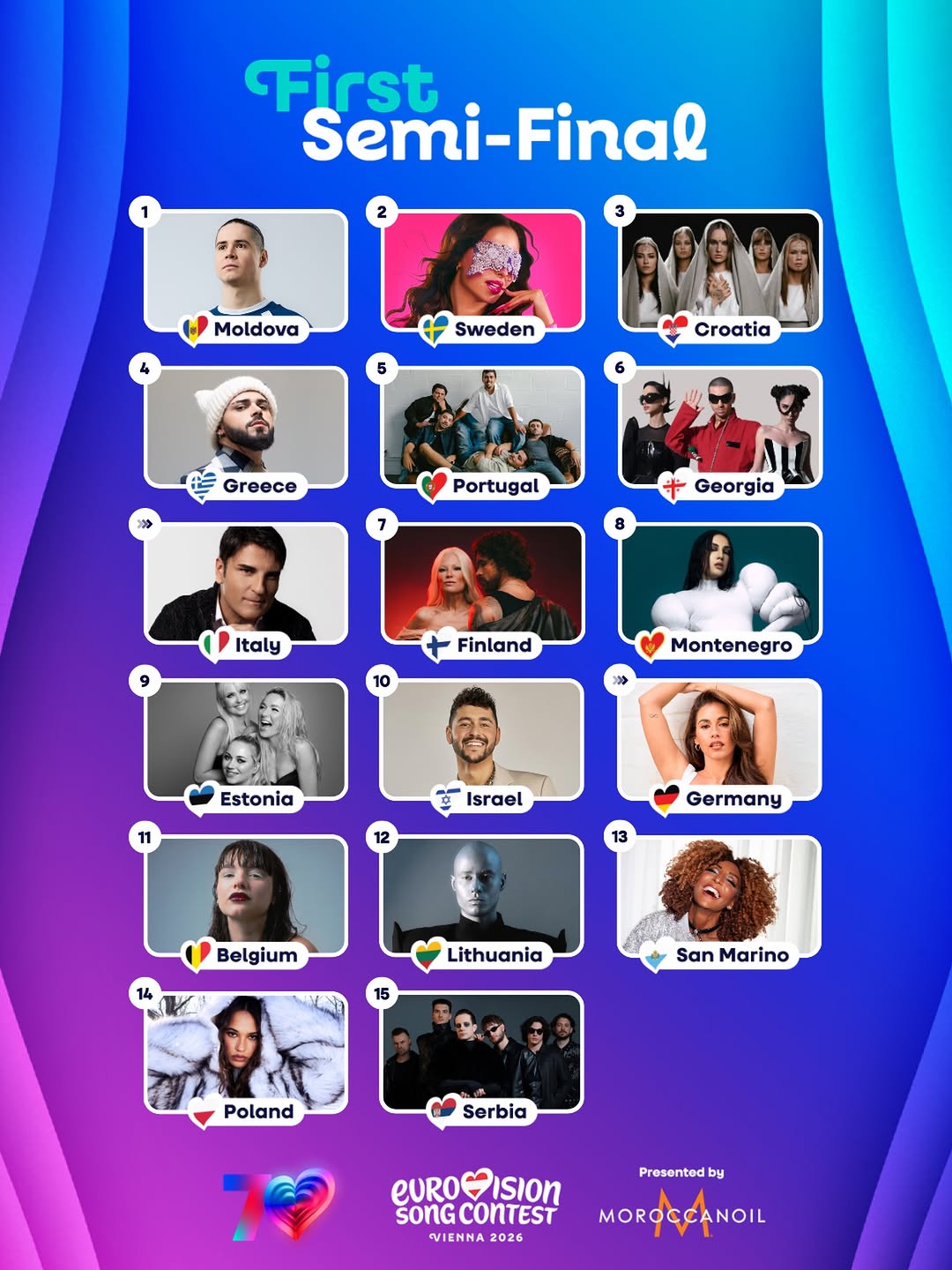 У першому півфіналі країни виступатимуть у такому порядку: