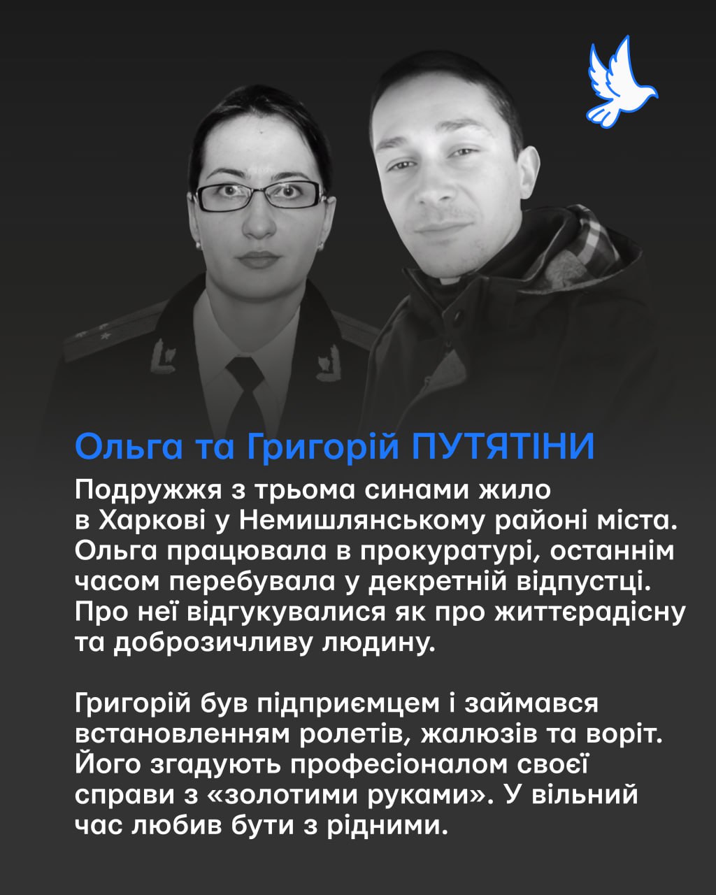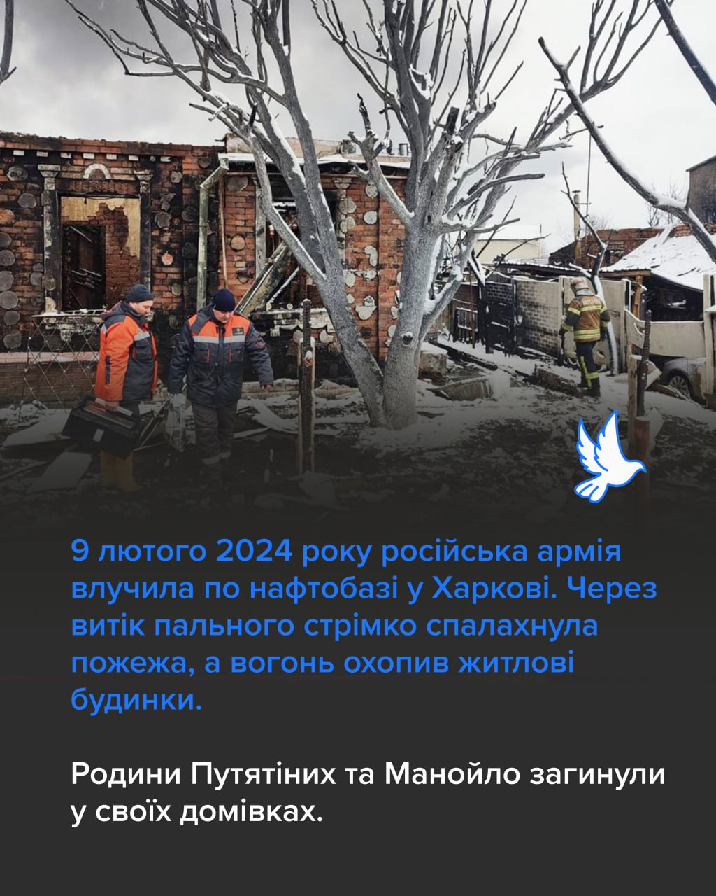 Два роки тому — 9 лютого 2024 року — російська армія завдала удару по Немишлянському району Харкова. Внаслідок атаки у своїх домівках загинули подружжя Путятіних, троє їхніх дітей, а також подружжя Манойло.
