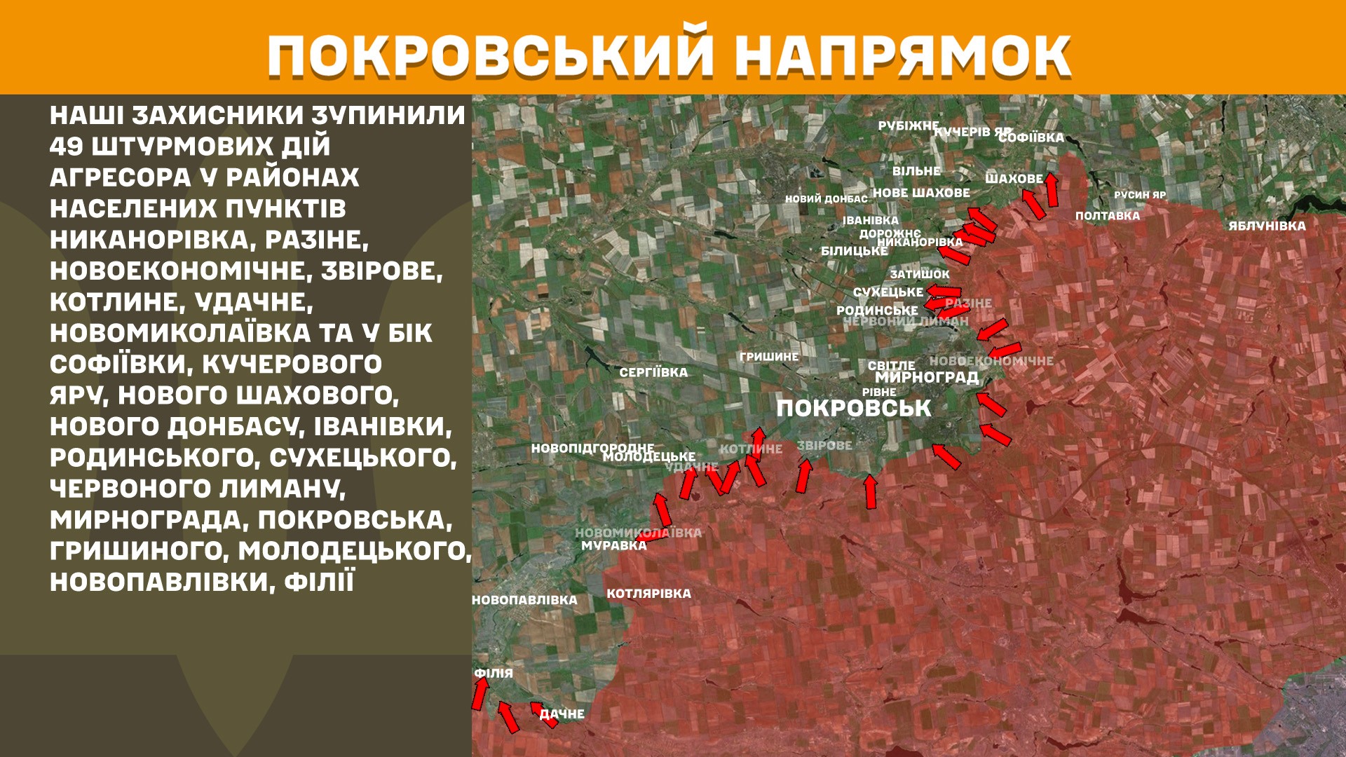 На Покровському напрямку наші захисники зупинили 49 штурмових дій агресора у районах населених пунктів Никанорівка, Разіне, Новоекономічне, Звірове, Котлине, Удачне, Новомиколаївка та у бік Софіївки, Кучерового Яру, Нового Шахового, Нового Донбасу, Іванівки, Родинського, Сухецького, Червоного Лиману, Мирнограда, Покровська, Гришиного, Молодецького, Новопавлівки, Філії.