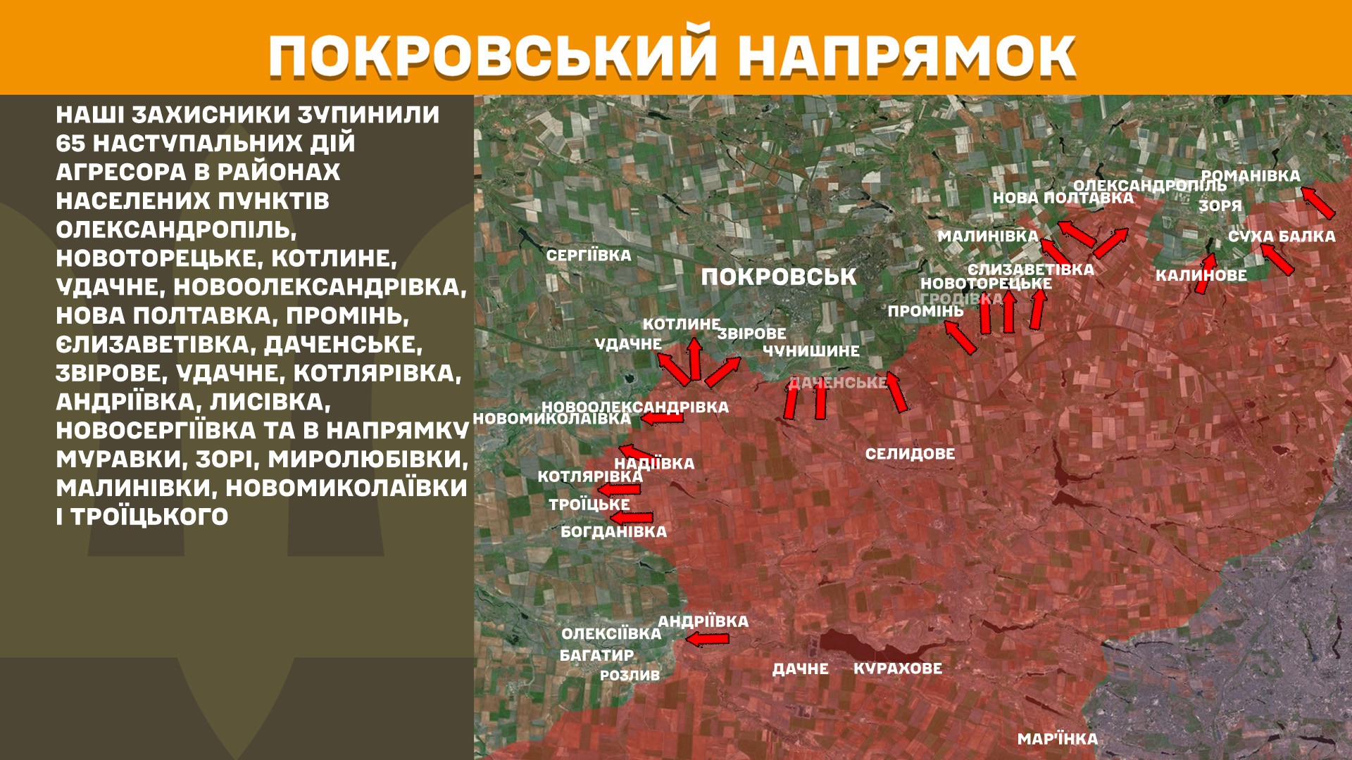 На Покровському напрямку наші захисники зупинили 65 наступальних дій агресора в районах населених пунктів Олександропіль, Новоторецьке, Котлине, Удачне, Новоолександрівка, Нова Полтавка, Промінь, Єлизаветівка, Даченське, Звірове, Удачне, Котлярівка, Андріївка, Лисівка, Новосергіївка та в напрямку Муравки, Зорі, Миролюбівки, Малинівки, Новомиколаївки і Троїцького.