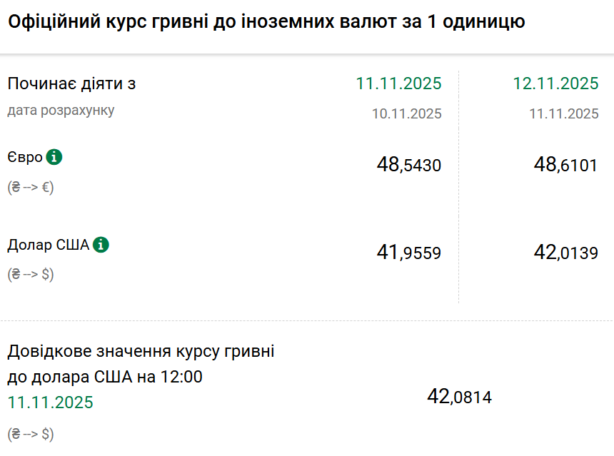 Так, на середу, 12 листопада, Нацбанк встановив офіційний курс на рівні 42,01 гривні за один долар. Офіційний курс у вівторок становив 41,95 гривні за один долар. На готівковому ринку долар впав на 20 копійок — 41,95 гривні.