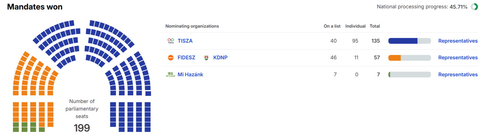 Зараз же, за підрахунками 45,71% бюлетенів, "Тиса" має 135, а "Фідес" — 57. Також 7 місць може отримати ультраправа партія "Наша батьківщина". Для конституційної більшості в парламенті потрібні 133 місця.