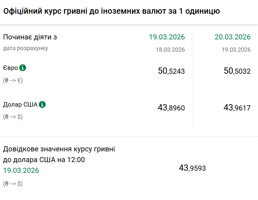 Так, на п'ятницю, 20 березня, Нацбанк встановив офіційний курс на рівні 43,96 гривні за один долар. Офіційний курс у четвер був 43,89. На готівковому ринку долар не змінився — 43,15 гривні.