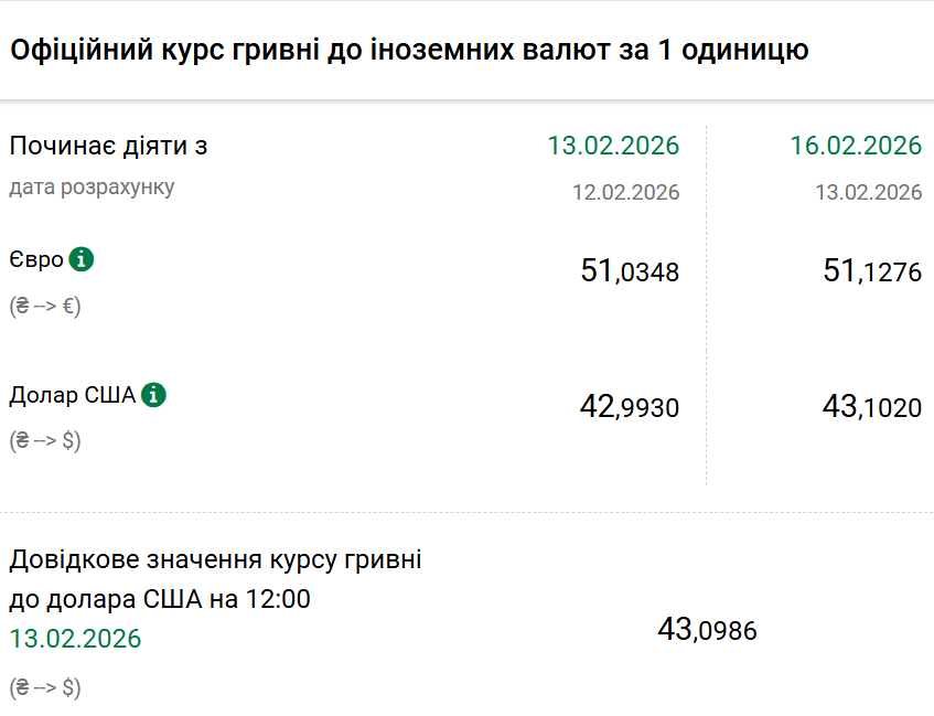Так, на понеділок, 16 лютого, Нацбанк встановив офіційний курс на рівні 43,10 гривні за один долар. Офіційний курс у п'ятницю був 42,99. На готівковому ринку долар впав на п'ять копійок — 42,85 гривні.