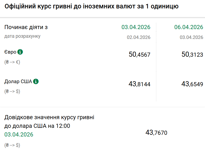 Так, на понеділок, 6 квітня, Нацбанк встановив офіційний курс на рівні 43,65 гривні за один долар. Офіційний курс у п'ятницю був 43,81. На готівковому ринку долар не змінився — 43,25 гривні.