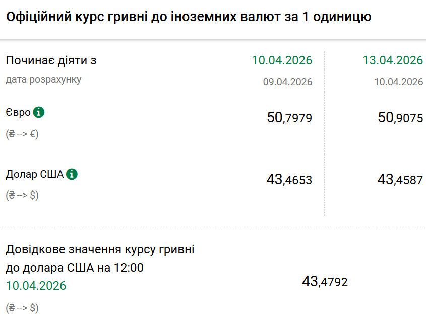Так, на понеділок, 13 квітня, Нацбанк встановив офіційний курс на рівні 43,45 гривні за один долар. Офіційний курс у п'ятницю був 43,46. На готівковому ринку долар не змінився — 43,15 гривні.