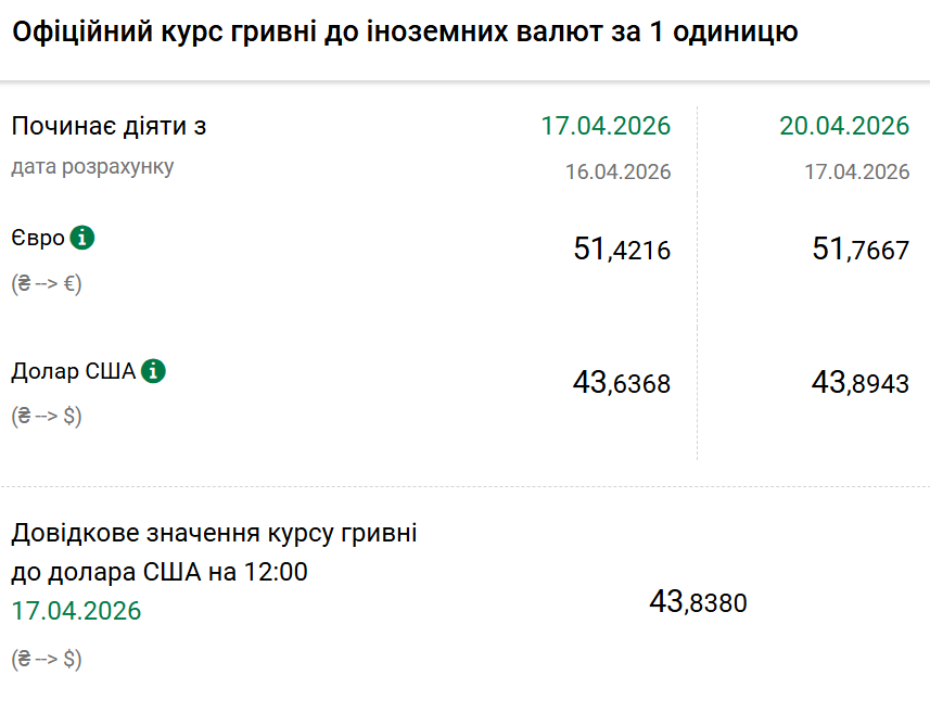 Так, на понеділок, 20 квітня, Нацбанк встановив офіційний курс на рівні 43,89 гривні за один долар. Офіційний курс у п'ятницю був 43,63.На готівковому ринку долар зріс на 10 копійок — 43,25 гривні.