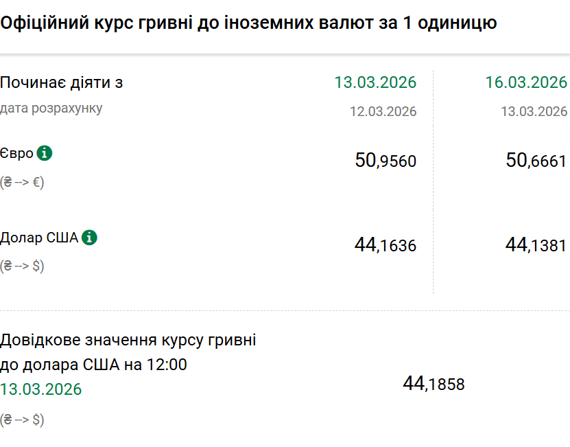 Так, на понеділок, 16 березня, Нацбанк встановив офіційний курс на рівні 44,13 гривні за один долар. Офіційний курс у п'ятницю був 44,16. На готівковому ринку долар не змінився — 43,40 гривні.