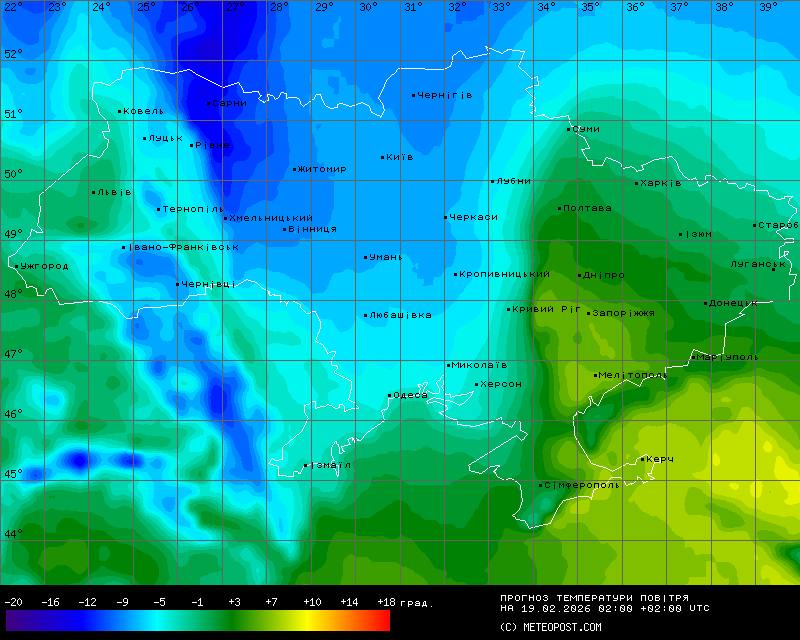 Вдень 19 лютого максимальна температура повітря становитиме -2…-5°С, на Півночі — місцями до -7°С, у південній частині, на південному Заході та південному Сході буде -1…+3°С, у Криму прогріє до +4…+7°С.