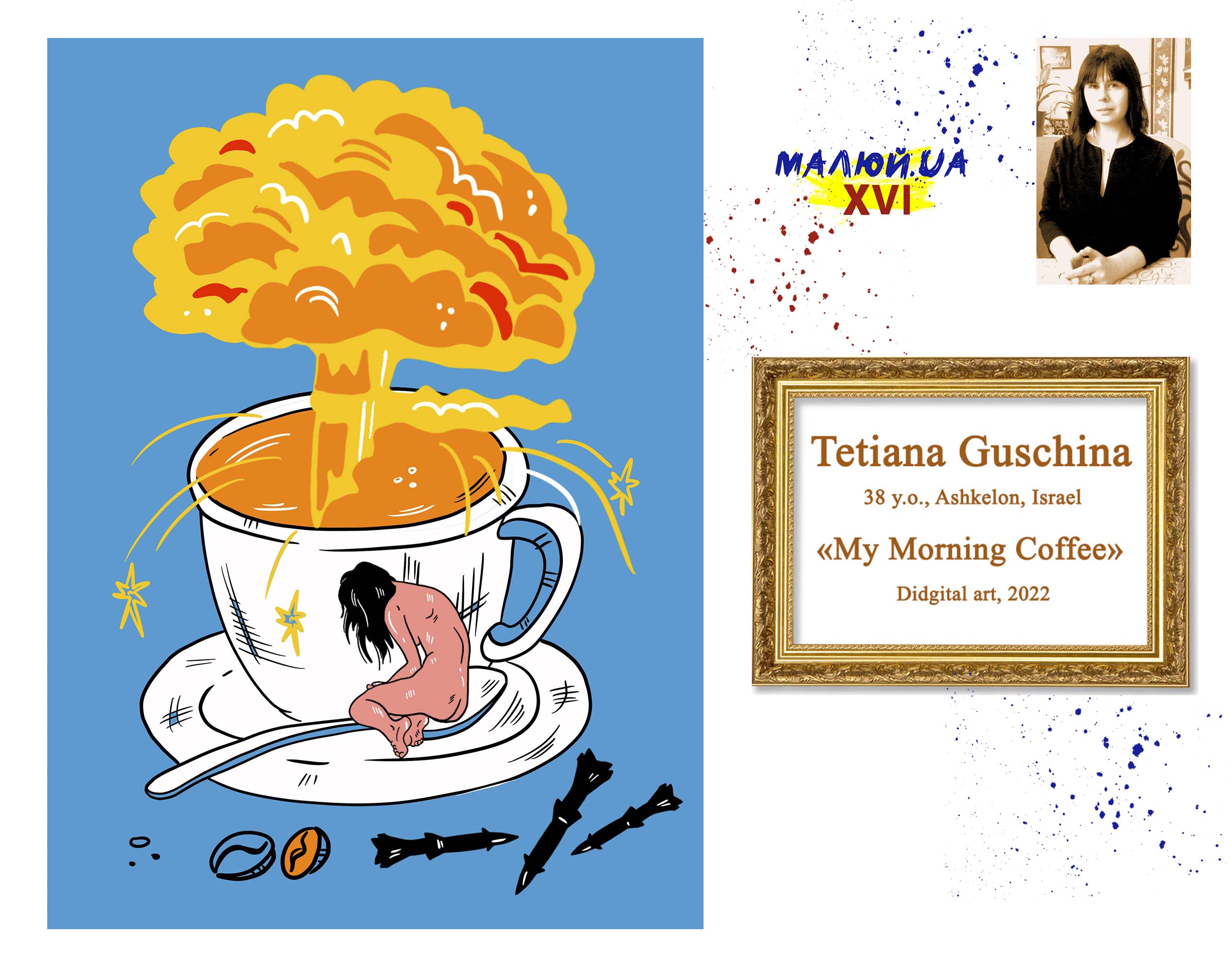 "На створення роботи мене надихнула цікава, але сумна ситуація, яка нагадала, що від долі не втечеш, і ми дійсно — покоління війни, де б не були, — ділиться художниця. — Був ранок, я годувала старшого сина і заспокоювала маму по телефону, бо Дніпро дуже сильно обстрілювали. Аж тут сирени злилися в одну — за вікном полетіли ракети із Сектора Гази… Вже ввечері я побачила, що моя ранкова кава все ще недоторкана стоїть на столі…"
