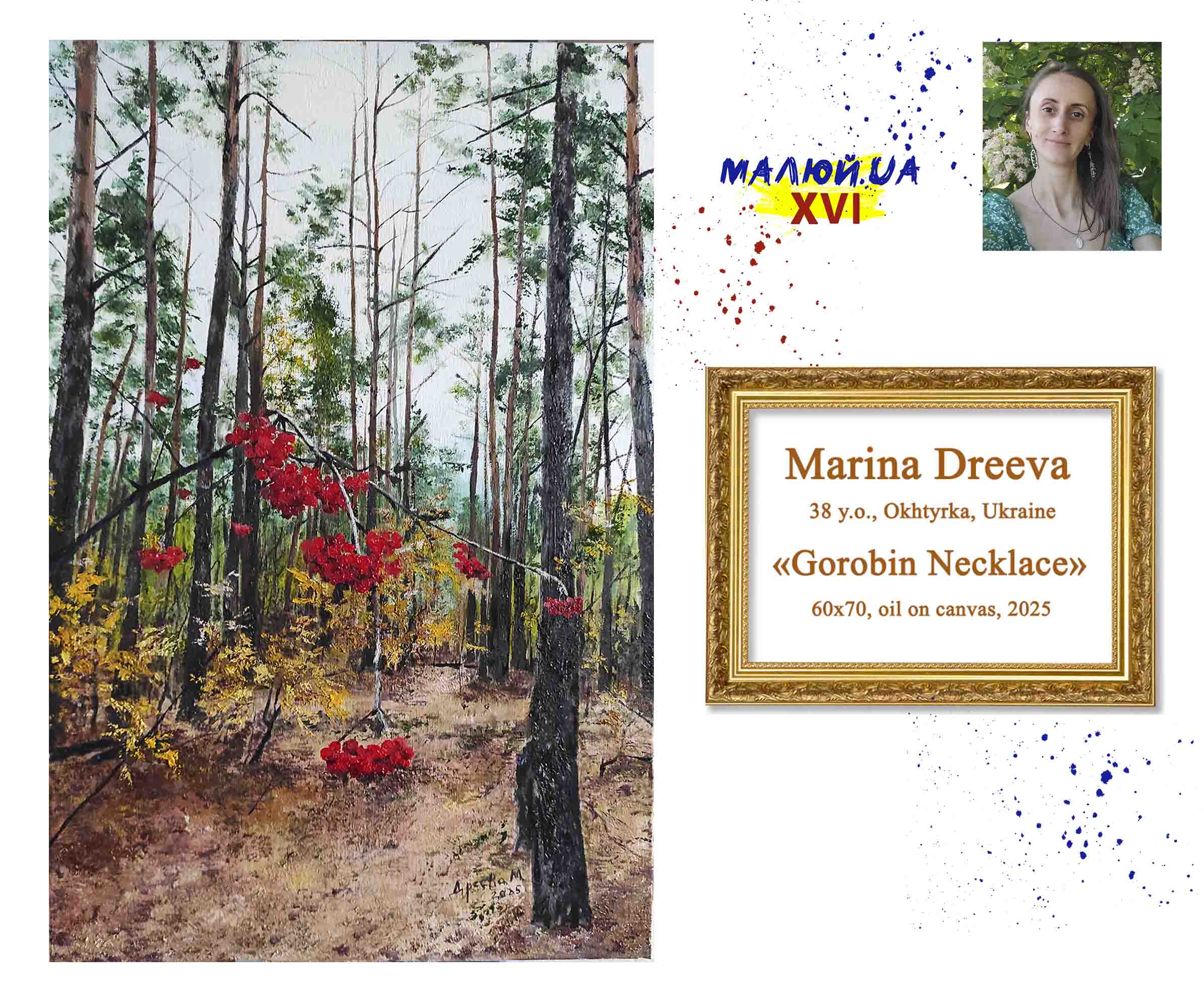 "Прогулянка лісом, гілка горобини, чудове місце надихнули мене на створення картини "Горобинове намисто" (60х70 см, олія, полотно, 2025 р.), яка була представлена у Києві на виставці переможців XVI Міжнародного художнього фестивалю МАЛЮЙ.UA у Центральному парку культури й відпочинку м. Києва біля Арки Свободи українського народу, а також у Чорногорії, Албанії та Іспанії. Сподіваюся, ця робота покаже красу української природи ще в багатьох країнах", — каже Марина Дреєва.