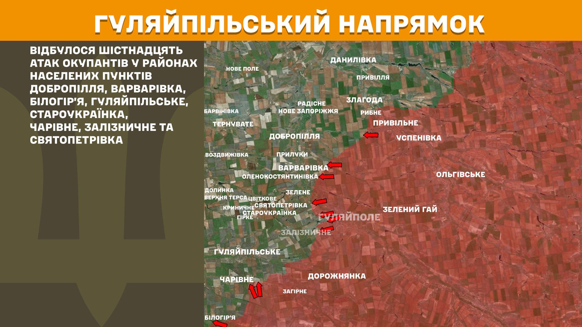 На Гуляйпільському напрямку відбулося шістнадцять атак окупантів у районах населених пунктів Добропілля, Варварівка, Білогір’я, Гуляйпільське, Староукраїнка, Чарівне, Залізничне та Святопетрівка.