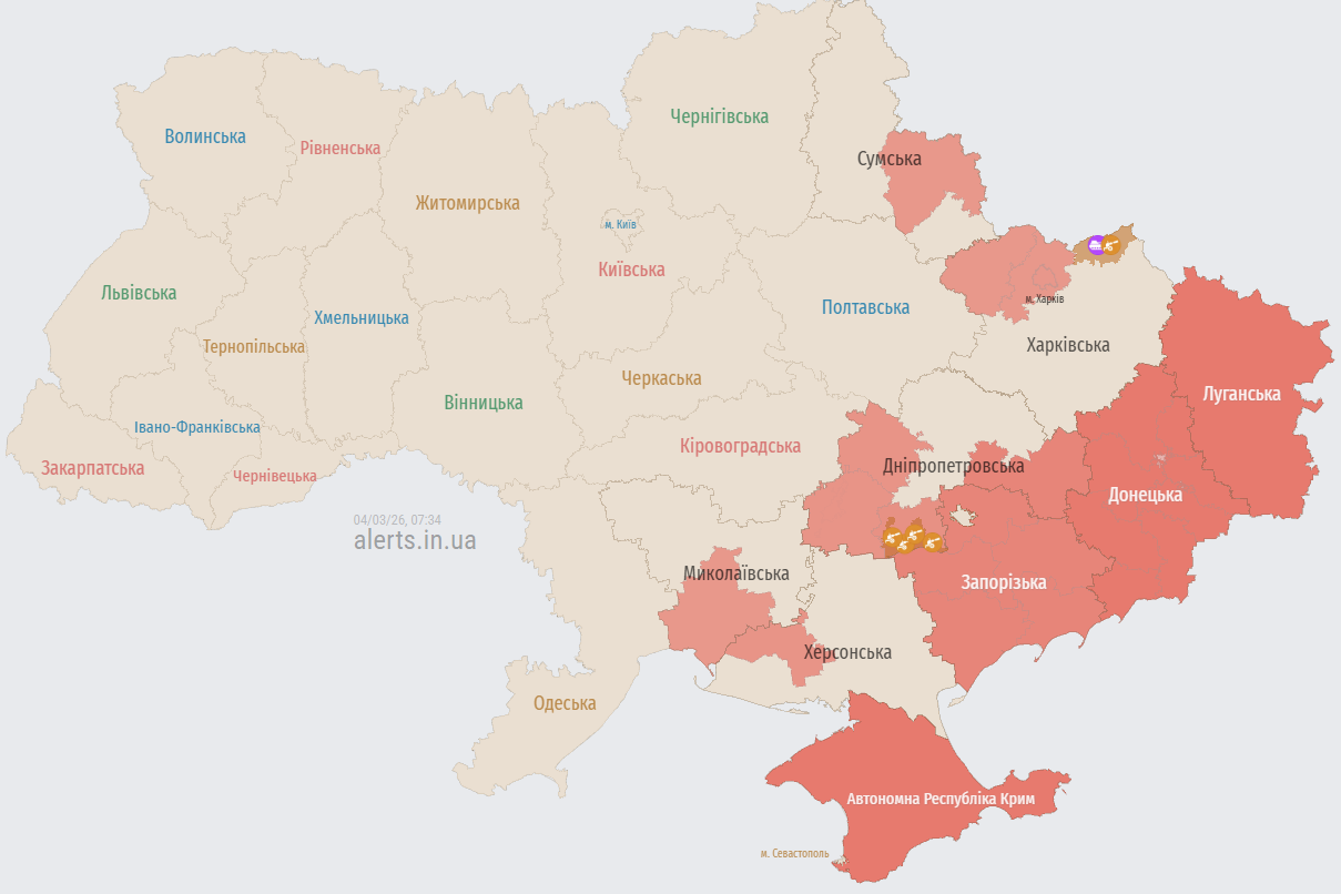 У середу зранку, 4 березня, російські окупаційні війська продовжують повітряний терор, атакуючи південні та східні області України за допомогою ударних безпілотників. Сили протиповітряної оборони зафіксували рух груп дронів, які курсують через акваторію Чорного моря та прикордонні райони, створюючи загрозу для мирних міст.