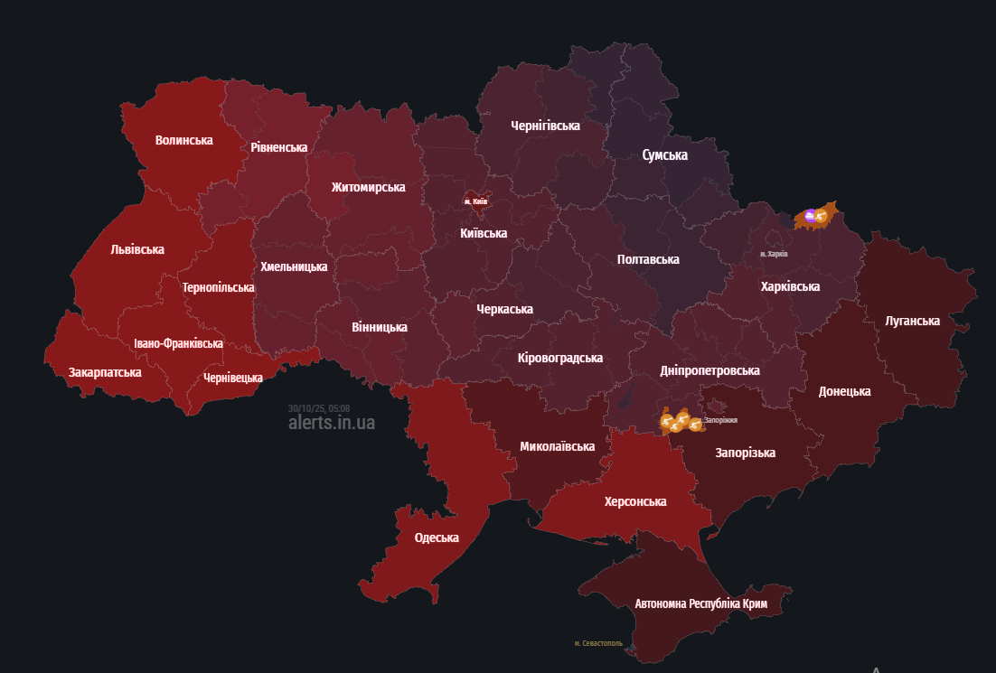 У ніч на четвер, 30 жовтня, російські окупанти здійснюють масований ракетний й дроновий обстріл. Крім крилатих ракет, ворог атакує гіперзвуковими ракетами "Кинджал".