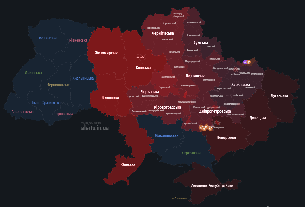 У ніч на неділю, 28 вересня, майже по всій території країни оголошено повітряну тривогу у зв'язку із ворожою комбінованою атакою. Російські безпілотники зафіксовані у низці областей, крім цього, окупанти здійснювали пуск швидкісних цілей.