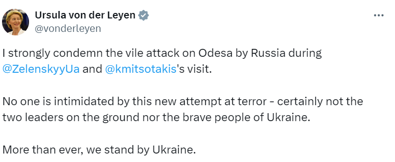 "Я рішуче засуджую підлий напад Росії на Одесу під час візиту Володимира Зеленського та Кіріакоса Міцотакіса. Ця нова спроба терору нікого не залякає — ні двох лідерів на місцях, ні відважний народ України", — заявила фон дер Ляєн.