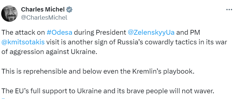 Президент Європейської Ради Шарль Мішель також засудив дії агресора та назвав атаку на Одесу ознакою "боягузливої тактики" Російської Федерації.