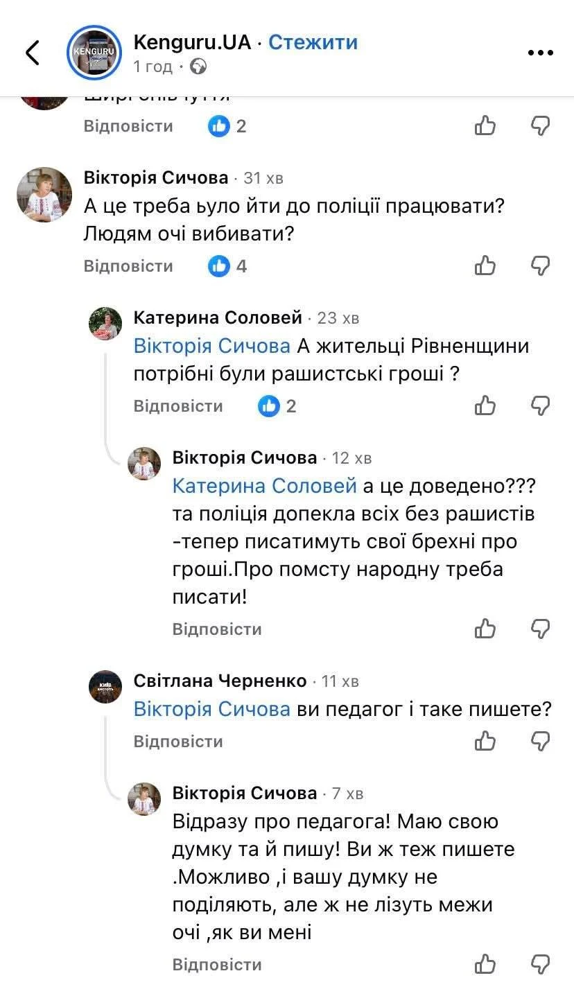 У неділю, 22 лютого, в день трагедії, в одній із Facebook-груп опублікували допис, присвячений загиблій правоохоронниці. У коментарях під ним педагогиня спершу поставила під сумнів роботу поліції, а згодом написала: "А це доведено? Та поліція допекла всіх без рашистів — тепер писатимуть свої брехні про гроші. Про помсту народну треба писати!".
