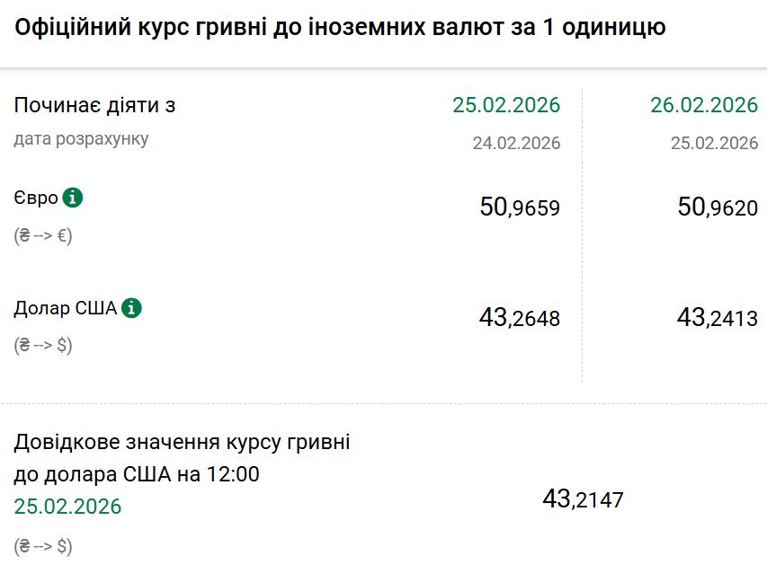 Так, на четвер, 26 лютого, Нацбанк встановив офіційний курс на рівні 43,24 гривні за один долар. Офіційний курс у середу був 43,26. На готівковому ринку долар не змінився — 43,05 гривні.