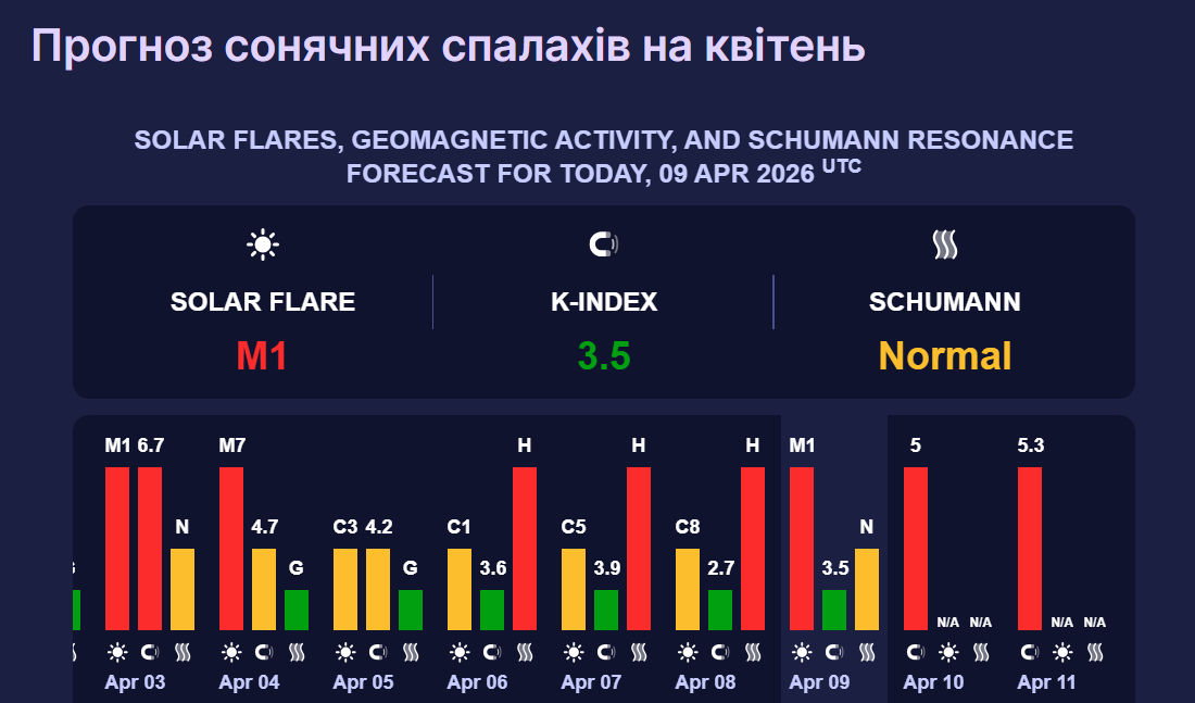 У суботу, 11 квітня, сонячна активність зросте до 5,3 бала. Такий К-індекс також відповідає магнітній бурі високої потужності.