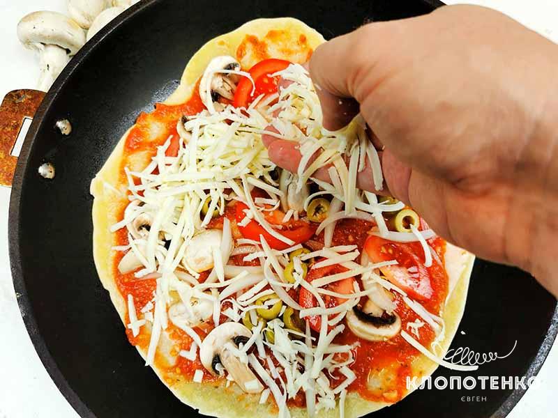 - Рівномірно викласти на основу із соусом інгредієнти начинки та посипати тертою моцарелою.