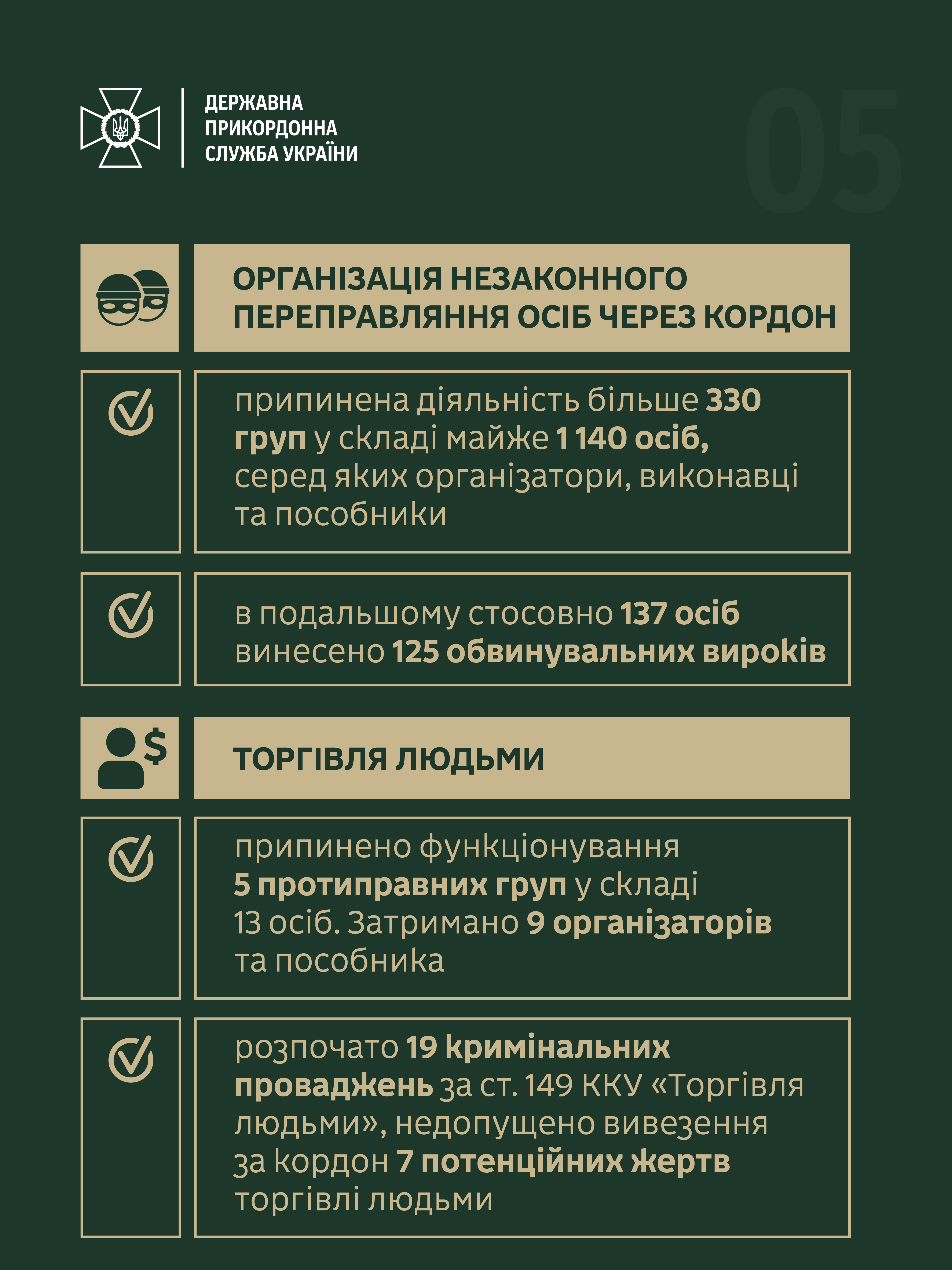 Лише з початку року ДПСУ припинила діяльність понад 330 груп, до складу яких входило майже 1 140 осіб (серед яких організатори, виконавці та пособники). Надалі стосовно 137 осіб було винесено вже 125 обвинувальних вироків.