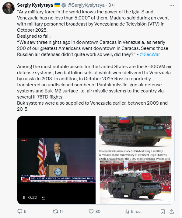 Перший заступник міністра закордонних справ України Сергій Кислиця на своїй сторінці у соцмережі Х (Twitter) прокоментував слова американського посадовця. Він заявив, що на озброєнні Венесуели перебували системи ППО С-300ВМ, два батальйонні комплекти яких були поставлені до Венесуели Росією у 2013 році. Окрім цього, у жовтні 2025 року Росія передала Венесуелі нерозголошену кількість ракетно-гарматних систем ППО "Панцир" та зенітно-ракетних комплексів "Бук-М2".