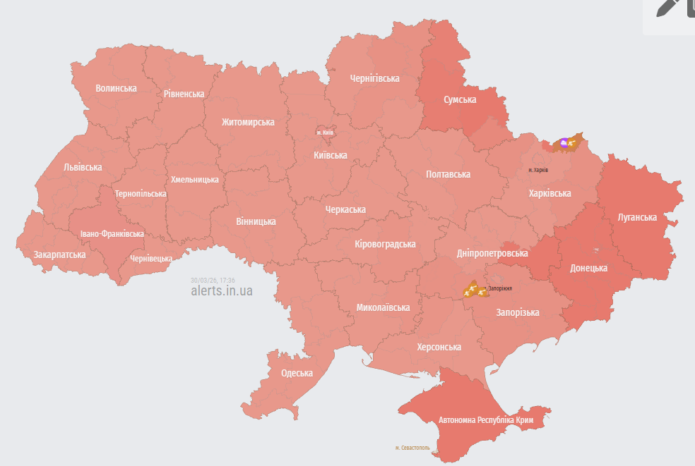 У понеділок, 30 березня, в Україні оголошували масштабну повітряну тривогу. Сирени у всіх областях лунали вп'яте за добу.