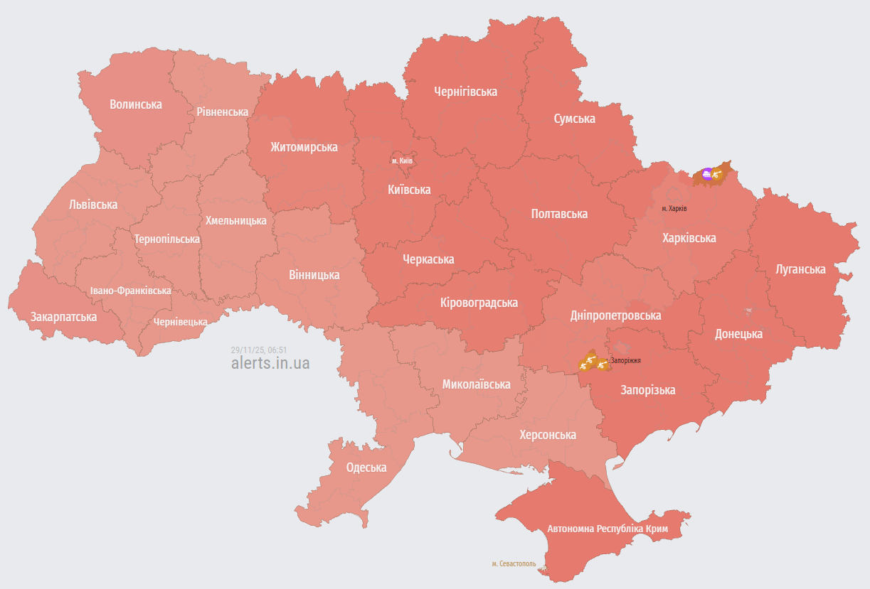 У суботу зранку, 29 листопада, російська армія атакує Україну ударними безпілотниками та ракетами. По всій державі оголошено повітряну тривогу.