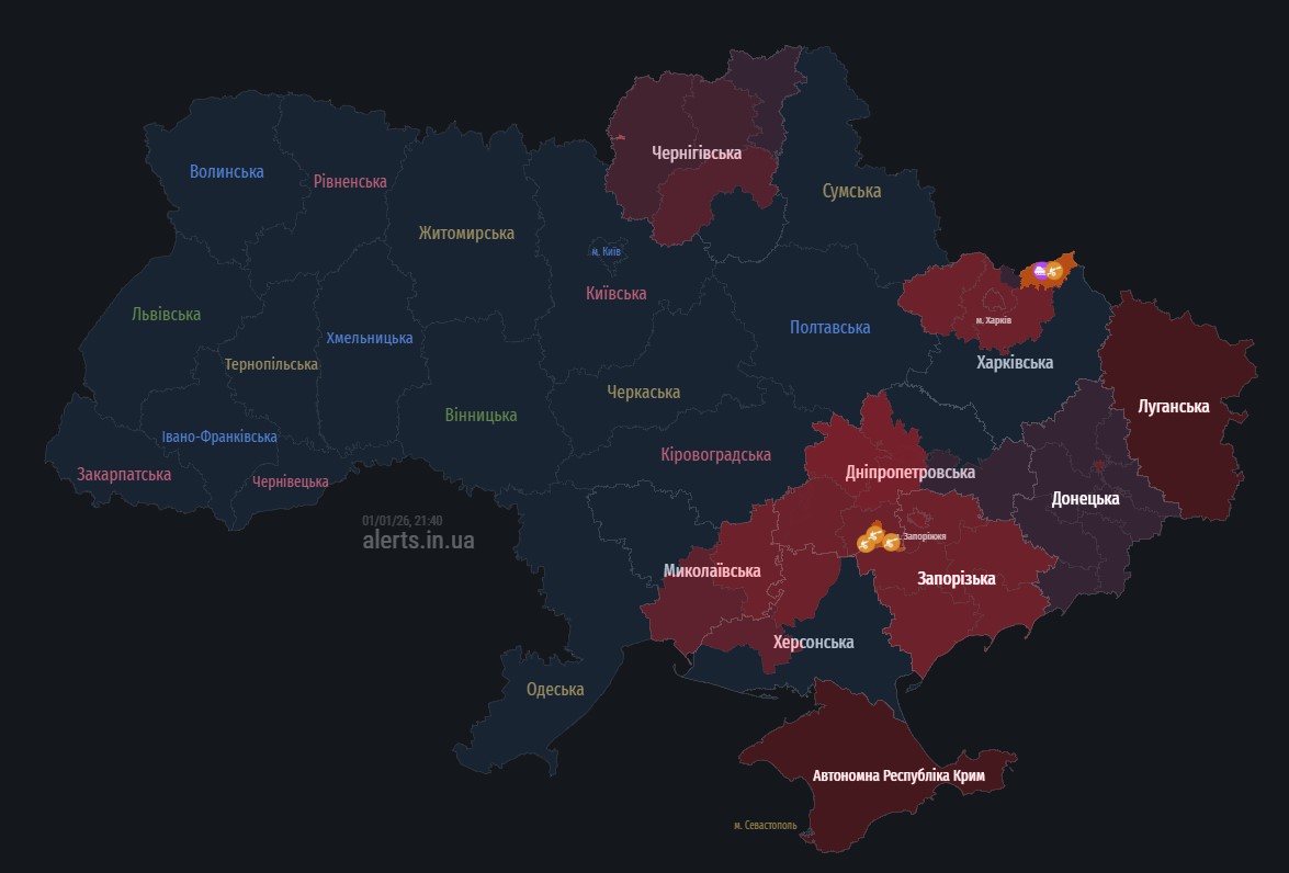 Ввечері 1 січня війська країни-агресорки атакують Україну ударними безпілотниками. У низці областей оголошено повітряну тривогу.